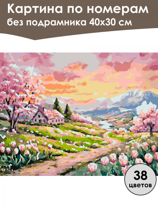 Картина по номерам без подрамника, размер 40х30 см, произведена нами. Она включает 38 оттенков и 2803 контуров, что придаёт ей глубину цвета и плавные переходы. Картина выглядит более ярко и живо. В комплект входит глянцевый лак, которым можно покрыть работу по желанию. Краски имеют хорошую укрывистость, хватает двух проходов что бы закрасить символы на схеме. Так же они сохраняют текстуру мазков, не растекаясь и не разглаживаясь полностью на холсте. При покрытии глянцевым лаком создаётся эффект приближенный к масляной живописи. Краски упакованы герметично, что сохраняет их жидкими. Все необходимые инструменты для начала работы также входят в комплект. Мы не используем экосольвентные чернила, которые содержат свинец и могут быть вредны для здоровья. Наши картины напечатаны безопасными водными пигментными чернилами, обеспечивающими чёткое изображение и легко читаемые обозначения. Холст плотный, имеет мелкую зернистость, легко разглаживается и устойчив к сминанию. Картина поставляется в бурой коробке. Следует отметить, что картина без подрамника её нельзя натянуть на подрамник из-за узких краёв, она предназначена для оформления в рамочку. Живописная про летняя сцена с цветущими розовыми деревьями, которые обрамляют деревенский домик с красной крышей, расположенный среди цветущих полей с тюльпанами, на фоне гор и закатного неба, окрашенного в яркие оттенки розового и оранжевого.