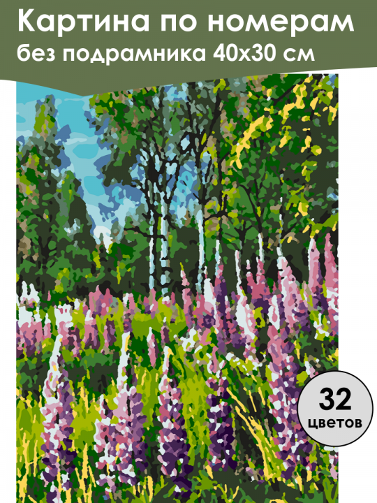 Картина по номерам без подрамника, размер 40х30 см, произведена нами. Она включает 32 оттенков и 3712 контуров, что придаёт ей глубину цвета и плавные переходы. Картина выглядит более ярко и живо. В комплект входит глянцевый лак, которым можно покрыть работу по желанию. Краски имеют хорошую укрывистость, хватает двух проходов что бы закрасить символы на схеме. Так же они сохраняют текстуру мазков, не растекаясь и не разглаживаясь полностью на холсте. При покрытии глянцевым лаком создаётся эффект приближенный к масляной живописи. Краски упакованы герметично, что сохраняет их жидкими. Все необходимые инструменты для начала работы также входят в комплект. Мы не используем экосольвентные чернила, которые содержат свинец и могут быть вредны для здоровья. Наши картины напечатаны безопасными водными пигментными чернилами, обеспечивающими чёткое изображение и легко читаемые обозначения. Холст плотный, имеет мелкую зернистость, легко разглаживается и устойчив к сминанию. Картина поставляется в бурой коробке. Следует отметить, что картина без подрамника её нельзя натянуть на подрамник из-за узких краёв, она предназначена для оформления в рамочку. Живописное пасторальное полотно с полем цветущих лесных люпинов на переднем плане, окруженное густыми зелеными деревьями под ярким голубым небом, создающим атмосферу умиротворения и гармонии с природой.