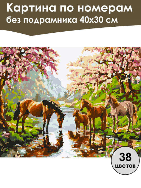 Картина по номерам без подрамника, размер 40х30 см, произведена нами. Она включает 38 оттенков и 3448 контуров, что придаёт ей глубину цвета и плавные переходы. Картина выглядит более ярко и живо. В комплект входит глянцевый лак, которым можно покрыть работу по желанию. Краски имеют хорошую укрывистость, хватает двух проходов что бы закрасить символы на схеме. Так же они сохраняют текстуру мазков, не растекаясь и не разглаживаясь полностью на холсте. При покрытии глянцевым лаком создаётся эффект приближенный к масляной живописи. Краски упакованы герметично, что сохраняет их жидкими. Все необходимые инструменты для начала работы также входят в комплект. Мы не используем экосольвентные чернила, которые содержат свинец и могут быть вредны для здоровья. Наши картины напечатаны безопасными водными пигментными чернилами, обеспечивающими чёткое изображение и легко читаемые обозначения. Холст плотный, имеет мелкую зернистость, легко разглаживается и устойчив к сминанию. Картина поставляется в бурой коробке. Следует отметить, что картина без подрамника её нельзя натянуть на подрамник из-за узких краёв, она предназначена для оформления в рамочку. Три лошади и жеребёнок на берегу реки среди зелёной травы и весенних деревьев с розовыми цветами; одна лошадь пьёт воду, отражаясь в реке, а вокруг пейзаж из холмов и цветущих ветвей создаёт атмосферу умиротворения и гармонии.