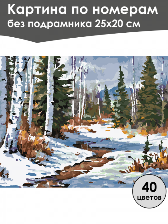 Картина по номерам без подрамника, размер 25х20 см, произведена нами. Она включает 40 оттенков и 1682 контуров, что придаёт ей глубину цвета и плавные переходы. Картина выглядит более ярко и живо. В комплект входит глянцевый лак, которым можно покрыть работу по желанию. Краски качественные, имеют хорошую укрывистость, хватает двух проходов что бы закрасить символы на схеме. Они упакованы герметично, что сохраняет их жидкими. Все необходимые инструменты для начала работы также включены в комплект. Мы не используем экосольвентные чернила, которые содержат свинец и могут быть вредны для здоровья. Наши картины напечатаны безопасными водными пигментными чернилами, обеспечивающими чёткое изображение и легко читаемые обозначения. Холст плотный, имеет мелкую зернистость, легко разглаживается и устойчив к сминанию. Картина поставляется в бурой коробке. Следует отметить, что картина без подрамника её нельзя натянуть на подрамник из-за узких краёв, она предназначена для оформления в рамочку. Пейзаж зимнего леса, выполненный в технике живописи; березы с белыми стволами соседствуют с густыми зелеными елями, вокруг которых лежит снег, а небольшой ручей петляет между деревьями, создавая контраст с заснеженным покровом и насыщенными оттенками растительности; небо покрыто легкими облаками, придающими сцене спокойное зимнее настроение.
