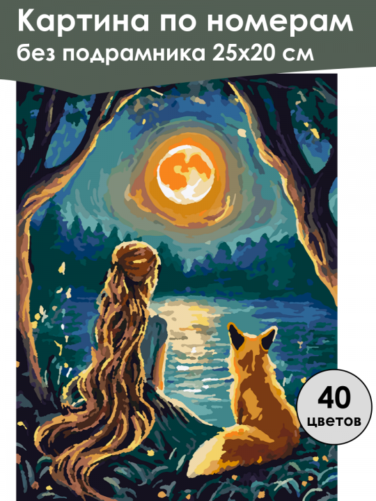 Картина по номерам без подрамника, размер 25х20 см, произведена нами. Она включает 40 оттенков и 1298 контуров, что придаёт ей глубину цвета и плавные переходы. Картина выглядит более ярко и живо. В комплект входит глянцевый лак, которым можно покрыть работу по желанию. Краски качественные, имеют хорошую укрывистость, хватает двух проходов что бы закрасить символы на схеме. Они упакованы герметично, что сохраняет их жидкими. Все необходимые инструменты для начала работы также включены в комплект. Мы не используем экосольвентные чернила, которые содержат свинец и могут быть вредны для здоровья. Наши картины напечатаны безопасными водными пигментными чернилами, обеспечивающими чёткое изображение и легко читаемые обозначения. Холст плотный, имеет мелкую зернистость, легко разглаживается и устойчив к сминанию. Картина поставляется в бурой коробке. Следует отметить, что картина без подрамника её нельзя натянуть на подрамник из-за узких краёв, она предназначена для оформления в рамочку. Девушка с длинными волнистыми волосами и лисица сидят спиной к зрителю на берегу водоёма, любуясь полнолунием и отражением луны на воде, окружённые густой лесной растительностью; луна светится яркими оранжевыми и жёлтыми оттенками, создавая сказочную атмосферу ночи.