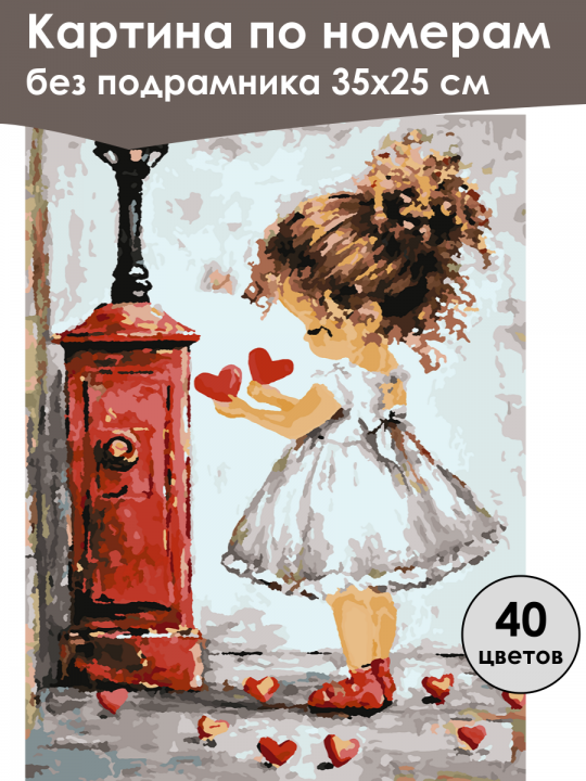 Картина по номерам без подрамника, размер 35х25 см, произведена нами. Она включает 40 оттенков и 2026 контуров, что придаёт ей глубину цвета и плавные переходы. Картина выглядит более ярко и живо. В комплект входит глянцевый лак, которым можно покрыть работу по желанию. Краски качественные, имеют хорошую укрывистость, хватает двух проходов что бы закрасить символы на схеме. Они упакованы герметично, что сохраняет их жидкими. Все необходимые инструменты для начала работы также включены в комплект. Мы не используем экосольвентные чернила, которые содержат свинец и могут быть вредны для здоровья. Наши картины напечатаны безопасными водными пигментными чернилами, обеспечивающими чёткое изображение и легко читаемые обозначения. Холст плотный, имеет мелкую зернистость, легко разглаживается и устойчив к сминанию. Картина поставляется в защищённой бурой коробке. Следует отметить, что картина без подрамника её нельзя натянуть на подрамник из-за узких краёв, она предназначена для оформления в рамочку. Маленькая девочка с кудрявыми волосами, одетая в белое платье и красные туфли, стоящая рядом с красным почтовым ящиком; в руках она держит красные сердечки, а на земле рядом с ней тоже лежат сердечки.