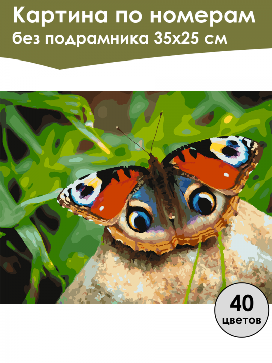 Картина по номерам без подрамника, размер 35х25 см, произведена нами. Она включает 40 оттенков и 1291 контуров, что придаёт ей глубину цвета и плавные переходы. Картина выглядит более ярко и живо. В комплект входит глянцевый лак, которым можно покрыть работу по желанию. Краски качественные, имеют хорошую укрывистость, хватает двух проходов что бы закрасить символы на схеме. Они упакованы герметично, что сохраняет их жидкими. Все необходимые инструменты для начала работы также включены в комплект. Мы не используем экосольвентные чернила, которые содержат свинец и могут быть вредны для здоровья. Наши картины напечатаны безопасными водными пигментными чернилами, обеспечивающими чёткое изображение и легко читаемые обозначения. Холст плотный, имеет мелкую зернистость, легко разглаживается и устойчив к сминанию. Картина поставляется в защищённой бурой коробке. Следует отметить, что картина без подрамника её нельзя натянуть на подрамник из-за узких краёв, она предназначена для оформления в рамочку. Яркая бабочка с развернутыми крыльями, украшенными красными, синими и черными узорами, похожими на глаза, сидит на поверхности, возможно, на камне, на фоне зеленой растительности.