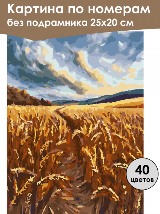 Картина по номерам без подрамника, размер 25х20 см, произведена нами. Она включает 40 оттенков и 1405 контуров, что придаёт ей глубину цвета и плавные переходы. Картина выглядит более ярко и живо. В комплект входит глянцевый лак, которым можно покрыть работу по желанию. Краски качественные, имеют хорошую укрывистость, хватает двух проходов что бы закрасить символы на схеме. Они упакованы герметично, что сохраняет их жидкими. Все необходимые инструменты для начала работы также включены в комплект. Мы не используем экосольвентные чернила, которые содержат свинец и могут быть вредны для здоровья. Наши картины напечатаны безопасными водными пигментными чернилами, обеспечивающими чёткое изображение и легко читаемые обозначения. Холст плотный, имеет мелкую зернистость, легко разглаживается и устойчив к сминанию. Картина поставляется в бурой коробке. Следует отметить, что картина без подрамника её нельзя натянуть на подрамник из-за узких краёв, она предназначена для оформления в рамочку. Поле золотистой пшеницы, раскинувшееся под драматичным небом с облаками разного цвета, от светло-серого до оранжево-розового, создающими живописный контраст; пшеничные колосья колышутся на ветру, устремляясь вдаль по тропинке, тянущейся к горизонту, где виднеются темные силуэты леса и холмов.