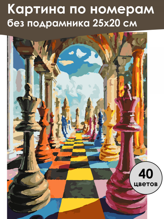Картина по номерам без подрамника, размер 25х20 см, произведена нами. Она включает 40 оттенков и 1309 контуров, что придаёт ей глубину цвета и плавные переходы. Картина выглядит более ярко и живо. В комплект входит глянцевый лак, которым можно покрыть работу по желанию. Краски качественные, имеют хорошую укрывистость, хватает двух проходов что бы закрасить символы на схеме. Они упакованы герметично, что сохраняет их жидкими. Все необходимые инструменты для начала работы также включены в комплект. Мы не используем экосольвентные чернила, которые содержат свинец и могут быть вредны для здоровья. Наши картины напечатаны безопасными водными пигментными чернилами, обеспечивающими чёткое изображение и легко читаемые обозначения. Холст плотный, имеет мелкую зернистость, легко разглаживается и устойчив к сминанию. Картина поставляется в бурой коробке. Следует отметить, что картина без подрамника её нельзя натянуть на подрамник из-за узких краёв, она предназначена для оформления в рамочку. Абстракция с шахматными фигурами в виде гигантских пешек, выстроенных вдоль длинного коридора с колоннами и арочными сводами, пол которого покрыт квадратами чередующихся цветов, создавая впечатление глубины и перспективы под ясным голубым небом с белыми облаками.