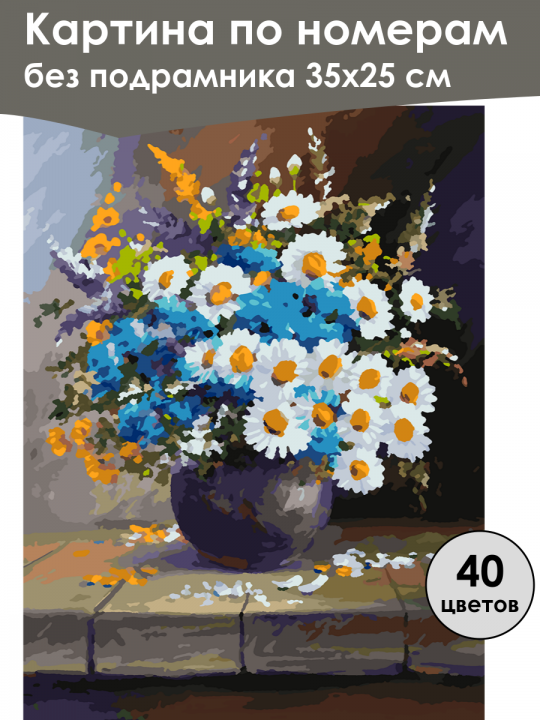 Картина по номерам без подрамника, размер 35х25 см, произведена нами. Она включает 40 оттенков и 1552 контуров, что придаёт ей глубину цвета и плавные переходы. Картина выглядит более ярко и живо. В комплект входит глянцевый лак, которым можно покрыть работу по желанию. Краски качественные, имеют хорошую укрывистость, хватает двух проходов что бы закрасить символы на схеме. Они упакованы герметично, что сохраняет их жидкими. Все необходимые инструменты для начала работы также включены в комплект. Мы не используем экосольвентные чернила, которые содержат свинец и могут быть вредны для здоровья. Наши картины напечатаны безопасными водными пигментными чернилами, обеспечивающими чёткое изображение и легко читаемые обозначения. Холст плотный, имеет мелкую зернистость, легко разглаживается и устойчив к сминанию. Картина поставляется в защищённой бурой коробке. Следует отметить, что картина без подрамника её нельзя натянуть на подрамник из-за узких краёв, она предназначена для оформления в рамочку. Большой букет в керамической вазе на поверхности, заполненной разнообразными цветами — белыми ромашками с оранжевыми сердцевинами, голубыми и оранжевыми цветами, окружёнными зелёной листвой, на фоне размытой тёмной стены, что создаёт яркий и жизнерадостный контраст.