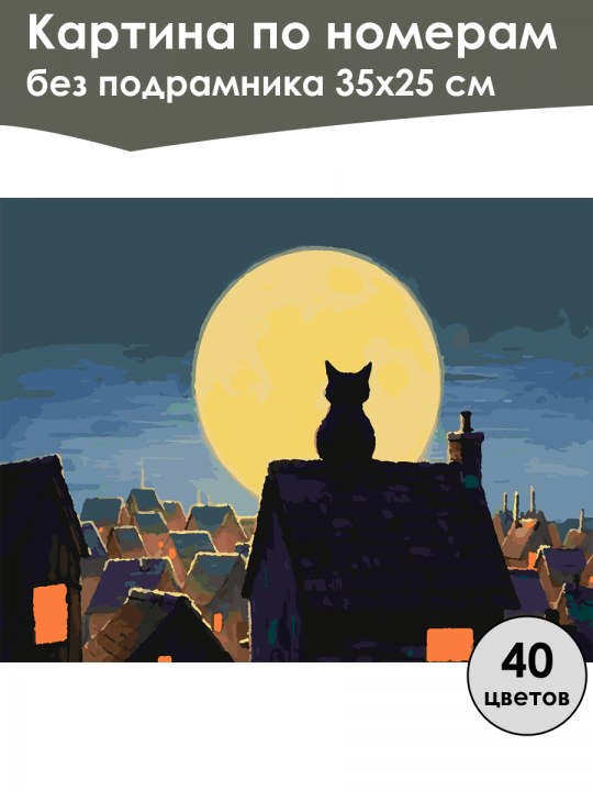 Картина по номерам без подрамника, размер 35х25 см, произведена нами. Она включает 40 оттенков и 694 контуров, что придаёт ей глубину цвета и плавные переходы. Картина выглядит более ярко и живо. В комплект входит глянцевый лак, которым можно покрыть работу по желанию. Краски качественные, имеют хорошую укрывистость, хватает двух проходов что бы закрасить символы на схеме. Они упакованы герметично, что сохраняет их жидкими. Все необходимые инструменты для начала работы также включены в комплект. Мы не используем экосольвентные чернила, которые содержат свинец и могут быть вредны для здоровья. Наши картины напечатаны безопасными водными пигментными чернилами, обеспечивающими чёткое изображение и легко читаемые обозначения. Холст плотный, имеет мелкую зернистость, легко разглаживается и устойчив к сминанию. Картина поставляется в защищённой бурой коробке. Следует отметить, что картина без подрамника её нельзя натянуть на подрамник из-за узких краёв, она предназначена для оформления в рамочку. Ночь, яркая полная луна освещает городские крыши; на переднем плане на одной из крыш сидит кошка, её силуэт выделяется на фоне луны, создавая атмосферу загадочности и спокойствия, окружающее пространство исчерчено освещёнными окнами домов и звёздами на тёмно-синем небе.