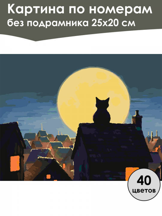 Картина по номерам без подрамника, размер 25х20 см, произведена нами. Она включает 40 оттенков и 447 контуров, что придаёт ей глубину цвета и плавные переходы. Картина выглядит более ярко и живо. В комплект входит глянцевый лак, которым можно покрыть работу по желанию. Краски качественные, имеют хорошую укрывистость, хватает двух проходов что бы закрасить символы на схеме. Они упакованы герметично, что сохраняет их жидкими. Все необходимые инструменты для начала работы также включены в комплект. Мы не используем экосольвентные чернила, которые содержат свинец и могут быть вредны для здоровья. Наши картины напечатаны безопасными водными пигментными чернилами, обеспечивающими чёткое изображение и легко читаемые обозначения. Холст плотный, имеет мелкую зернистость, легко разглаживается и устойчив к сминанию. Картина поставляется в бурой коробке. Следует отметить, что картина без подрамника её нельзя натянуть на подрамник из-за узких краёв, она предназначена для оформления в рамочку. Ночь, яркая полная луна освещает городские крыши; на переднем плане на одной из крыш сидит кошка, её силуэт выделяется на фоне луны, создавая атмосферу загадочности и спокойствия, окружающее пространство исчерчено освещёнными окнами домов и звёздами на тёмно-синем небе.