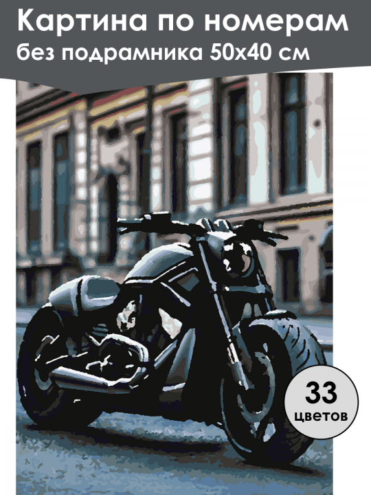 Картина по номерам без подрамника, размер 50х40 см, произведена нами. Она включает 33 оттенков и 2277 контуров, что придаёт ей глубину цвета и плавные переходы. Картина выглядит более ярко и живо. В комплект входит глянцевый лак, которым можно покрыть работу по желанию. Краски имеют хорошую укрывистость, хватает двух проходов что бы закрасить символы на схеме. Так же они сохраняют текстуру мазков, не растекаясь и не разглаживаясь полностью на холсте. При покрытии глянцевым лаком создаётся эффект приближенный к масляной живописи. Краски упакованы герметично, что сохраняет их жидкими. Все необходимые инструменты для начала работы также входят в комплект. Мы не используем экосольвентные чернила, которые содержат свинец и могут быть вредны для здоровья. Наши картины напечатаны безопасными водными пигментными чернилами, обеспечивающими чёткое изображение и легко читаемые обозначения. Холст плотный, имеет мелкую зернистость, легко разглаживается и устойчив к сминанию. Картина поставляется в бурой коробке. Следует отметить, что картина без подрамника её нельзя натянуть на подрамник из-за узких краёв, она предназначена для оформления в рамочку. Массивный мотоцикл с толстым задним колесом и блестящими элементами, стоящий на дороге на фоне старинного здания с высокими окнами и архитектурными деталями, создающими атмосферу города; изображение выполнено в стиле цифровой иллюстрации с акцентом на контрастные тени и текстуры.