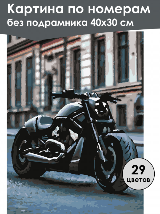 Картина по номерам без подрамника, размер 40х30 см, произведена нами. Она включает 29 оттенков и 1963 контуров, что придаёт ей глубину цвета и плавные переходы. Картина выглядит более ярко и живо. В комплект входит глянцевый лак, которым можно покрыть работу по желанию. Краски имеют хорошую укрывистость, хватает двух проходов что бы закрасить символы на схеме. Так же они сохраняют текстуру мазков, не растекаясь и не разглаживаясь полностью на холсте. При покрытии глянцевым лаком создаётся эффект приближенный к масляной живописи. Краски упакованы герметично, что сохраняет их жидкими. Все необходимые инструменты для начала работы также входят в комплект. Мы не используем экосольвентные чернила, которые содержат свинец и могут быть вредны для здоровья. Наши картины напечатаны безопасными водными пигментными чернилами, обеспечивающими чёткое изображение и легко читаемые обозначения. Холст плотный, имеет мелкую зернистость, легко разглаживается и устойчив к сминанию. Картина поставляется в бурой коробке. Следует отметить, что картина без подрамника её нельзя натянуть на подрамник из-за узких краёв, она предназначена для оформления в рамочку. Массивный мотоцикл с толстым задним колесом и блестящими элементами, стоящий на дороге на фоне старинного здания с высокими окнами и архитектурными деталями, создающими атмосферу города; изображение выполнено в стиле цифровой иллюстрации с акцентом на контрастные тени и текстуры.
