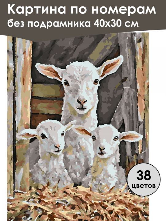Картина по номерам без подрамника, размер 40х30 см, произведена нами. Она включает 38 оттенков и 3551 контуров, что придаёт ей глубину цвета и плавные переходы. Картина выглядит более ярко и живо. В комплект входит глянцевый лак, которым можно покрыть работу по желанию. Краски имеют хорошую укрывистость, хватает двух проходов что бы закрасить символы на схеме. Так же они сохраняют текстуру мазков, не растекаясь и не разглаживаясь полностью на холсте. При покрытии глянцевым лаком создаётся эффект приближенный к масляной живописи. Краски упакованы герметично, что сохраняет их жидкими. Все необходимые инструменты для начала работы также входят в комплект. Мы не используем экосольвентные чернила, которые содержат свинец и могут быть вредны для здоровья. Наши картины напечатаны безопасными водными пигментными чернилами, обеспечивающими чёткое изображение и легко читаемые обозначения. Холст плотный, имеет мелкую зернистость, легко разглаживается и устойчив к сминанию. Картина поставляется в бурой коробке. Следует отметить, что картина без подрамника её нельзя натянуть на подрамник из-за узких краёв, она предназначена для оформления в рамочку. Коза и два маленьких козлёнка, стоящие рядом в деревянном сарае; животные выглядят пушистыми и милыми, а вокруг них разбросана солома, создавая уютную атмосферу.
