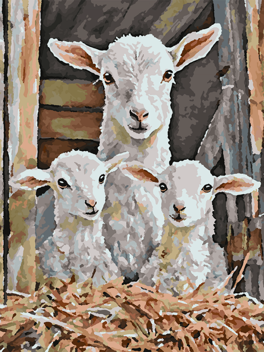 Картина по номерам на подрамнике, размер 40х30 см, произведена нами. Она включает 38 оттенков и 3551 контуров, что придаёт ей глубину цвета и плавные переходы. Картина выглядит более ярко и живо. В комплект входит глянцевый лак, которым можно покрыть работу по желанию. Краски имеют хорошую укрывистость, хватает двух проходов что бы закрасить символы на схеме. Так же они сохраняют текстуру мазков, не растекаясь и не разглаживаясь полностью на холсте. При покрытии глянцевым лаком создаётся эффект приближенный к масляной живописи. Краски упакованы герметично, что сохраняет их жидкими. Все необходимые инструменты для начала работы также включены в комплект, в том числе и крепления на стену. В картине используется крепкий подрамник со специальной вставкой, которая предотвращает провисание холста во время рисования. Это обеспечивает комфортный процесс работы и гарантирует, что холст всегда будет оставаться хорошо натянутым. Мы не используем экосольвентные чернила, которые содержат свинец и могут быть вредны для здоровья. Наши картины напечатаны безопасными водными пигментными чернилами, обеспечивающими чёткое изображение и легко читаемые обозначения. Холст плотный, имеет мелкую зернистость, легко разглаживается и устойчив к сминанию. Картина поставляется в защищённой бурой коробке. Коза и два маленьких козлёнка, стоящие рядом в деревянном сарае; животные выглядят пушистыми и милыми, а вокруг них разбросана солома, создавая уютную атмосферу.