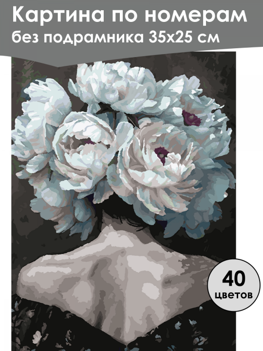 Картина по номерам без подрамника, размер 35х25 см, произведена нами. Она включает 40 оттенков и 1648 контуров, что придаёт ей глубину цвета и плавные переходы. Картина выглядит более ярко и живо. В комплект входит глянцевый лак, которым можно покрыть работу по желанию. Краски качественные, имеют хорошую укрывистость, хватает двух проходов что бы закрасить символы на схеме. Они упакованы герметично, что сохраняет их жидкими. Все необходимые инструменты для начала работы также включены в комплект. Мы не используем экосольвентные чернила, которые содержат свинец и могут быть вредны для здоровья. Наши картины напечатаны безопасными водными пигментными чернилами, обеспечивающими чёткое изображение и легко читаемые обозначения. Холст плотный, имеет мелкую зернистость, легко разглаживается и устойчив к сминанию. Картина поставляется в защищённой бурой коробке. Следует отметить, что картина без подрамника её нельзя натянуть на подрамник из-за узких краёв, она предназначена для оформления в рамочку. Стилизованный арт с изображением обнажённой спины человека, голова которого заменена пышным букетом крупных белых цветов с оттенками голубого и розового, на тёмном фоне.