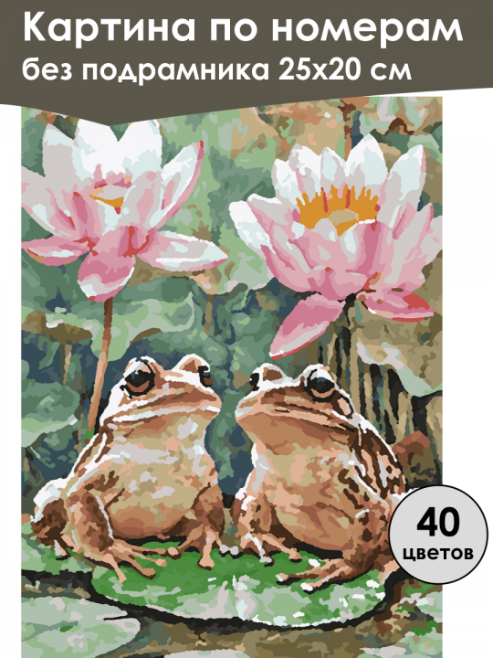 Картина по номерам без подрамника, размер 25х20 см, произведена нами. Она включает 40 оттенков и 1657 контуров, что придаёт ей глубину цвета и плавные переходы. Картина выглядит более ярко и живо. В комплект входит глянцевый лак, которым можно покрыть работу по желанию. Краски качественные, имеют хорошую укрывистость, хватает двух проходов что бы закрасить символы на схеме. Они упакованы герметично, что сохраняет их жидкими. Все необходимые инструменты для начала работы также включены в комплект. Мы не используем экосольвентные чернила, которые содержат свинец и могут быть вредны для здоровья. Наши картины напечатаны безопасными водными пигментными чернилами, обеспечивающими чёткое изображение и легко читаемые обозначения. Холст плотный, имеет мелкую зернистость, легко разглаживается и устойчив к сминанию. Картина поставляется в бурой коробке. Следует отметить, что картина без подрамника её нельзя натянуть на подрамник из-за узких краёв, она предназначена для оформления в рамочку. Два лягушонка сидят на зелёных кувшинках в спокойной воде, окружённой розовыми цветами лотоса с крупными лепестками и жёлтыми центрами, создавая гармоничную и идиллическую сцену природы.