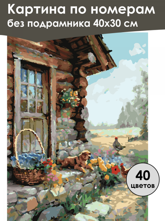 Картина по номерам без подрамника, размер 40х30 см, произведена нами. Она включает 40 оттенков и 2969 контуров, что придаёт ей глубину цвета и плавные переходы. Картина выглядит более ярко и живо. В комплект входит глянцевый лак, которым можно покрыть работу по желанию. Краски имеют хорошую укрывистость, хватает двух проходов что бы закрасить символы на схеме. Так же они сохраняют текстуру мазков, не растекаясь и не разглаживаясь полностью на холсте. При покрытии глянцевым лаком создаётся эффект приближенный к масляной живописи. Краски упакованы герметично, что сохраняет их жидкими. Все необходимые инструменты для начала работы также входят в комплект. Мы не используем экосольвентные чернила, которые содержат свинец и могут быть вредны для здоровья. Наши картины напечатаны безопасными водными пигментными чернилами, обеспечивающими чёткое изображение и легко читаемые обозначения. Холст плотный, имеет мелкую зернистость, легко разглаживается и устойчив к сминанию. Картина поставляется в бурой коробке. Следует отметить, что картина без подрамника её нельзя натянуть на подрамник из-за узких краёв, она предназначена для оформления в рамочку. Деревянный дом с открытой дверью на фоне ясного неба и цветущих растений; на каменной ступеньке лежит собака, рядом с плетёной корзиной с цветами, в поле видны куры.