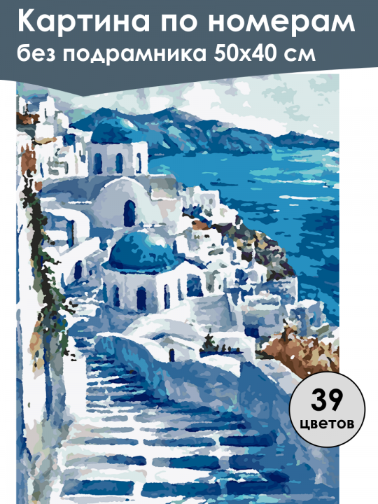 Картина по номерам без подрамника, размер 50х40 см, произведена нами. Она включает 39 оттенков и 2712 контуров, что придаёт ей глубину цвета и плавные переходы. Картина выглядит более ярко и живо. В комплект входит глянцевый лак, которым можно покрыть работу по желанию. Краски имеют хорошую укрывистость, хватает двух проходов что бы закрасить символы на схеме. Так же они сохраняют текстуру мазков, не растекаясь и не разглаживаясь полностью на холсте. При покрытии глянцевым лаком создаётся эффект приближенный к масляной живописи. Краски упакованы герметично, что сохраняет их жидкими. Все необходимые инструменты для начала работы также входят в комплект. Мы не используем экосольвентные чернила, которые содержат свинец и могут быть вредны для здоровья. Наши картины напечатаны безопасными водными пигментными чернилами, обеспечивающими чёткое изображение и легко читаемые обозначения. Холст плотный, имеет мелкую зернистость, легко разглаживается и устойчив к сминанию. Картина поставляется в бурой коробке. Следует отметить, что картина без подрамника её нельзя натянуть на подрамник из-за узких краёв, она предназначена для оформления в рамочку. Живописный вид на побережье с террасами, на которых расположены белые здания с характерными круглыми синими крышами, ведущие вниз по склону к бирюзовому морю, с величественными горами на горизонте под облачным небом.