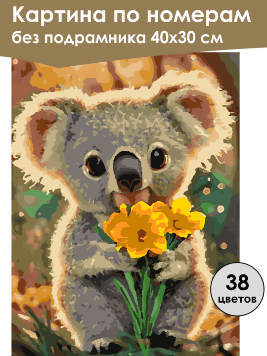 Картина по номерам без подрамника, размер 40х30 см, произведена нами. Она включает 38 оттенков и 1884 контуров, что придаёт ей глубину цвета и плавные переходы. Картина выглядит более ярко и живо. В комплект входит глянцевый лак, которым можно покрыть работу по желанию. Краски имеют хорошую укрывистость, хватает двух проходов что бы закрасить символы на схеме. Так же они сохраняют текстуру мазков, не растекаясь и не разглаживаясь полностью на холсте. При покрытии глянцевым лаком создаётся эффект приближенный к масляной живописи. Краски упакованы герметично, что сохраняет их жидкими. Все необходимые инструменты для начала работы также входят в комплект. Мы не используем экосольвентные чернила, которые содержат свинец и могут быть вредны для здоровья. Наши картины напечатаны безопасными водными пигментными чернилами, обеспечивающими чёткое изображение и легко читаемые обозначения. Холст плотный, имеет мелкую зернистость, легко разглаживается и устойчив к сминанию. Картина поставляется в бурой коробке. Следует отметить, что картина без подрамника её нельзя натянуть на подрамник из-за узких краёв, она предназначена для оформления в рамочку. Мультяшная коала с большими выразительными глазами, держащая в лапах букет ярко-жёлтых цветов нарциссов на фоне размытого природного ландшафта в тёплых тонах.