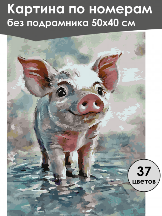 Картина по номерам без подрамника, размер 50х40 см, произведена нами. Она включает 37 оттенков и 2700 контуров, что придаёт ей глубину цвета и плавные переходы. Картина выглядит более ярко и живо. В комплект входит глянцевый лак, которым можно покрыть работу по желанию. Краски имеют хорошую укрывистость, хватает двух проходов что бы закрасить символы на схеме. Так же они сохраняют текстуру мазков, не растекаясь и не разглаживаясь полностью на холсте. При покрытии глянцевым лаком создаётся эффект приближенный к масляной живописи. Краски упакованы герметично, что сохраняет их жидкими. Все необходимые инструменты для начала работы также входят в комплект. Мы не используем экосольвентные чернила, которые содержат свинец и могут быть вредны для здоровья. Наши картины напечатаны безопасными водными пигментными чернилами, обеспечивающими чёткое изображение и легко читаемые обозначения. Холст плотный, имеет мелкую зернистость, легко разглаживается и устойчив к сминанию. Картина поставляется в бурой коробке. Следует отметить, что картина без подрамника её нельзя натянуть на подрамник из-за узких краёв, она предназначена для оформления в рамочку. Нарисованное изображение милого поросёнка с белыми и розовыми пятнами, стоящего в воде; текстура напоминает акварель, с размытыми переходами цветов и мягким фоном.