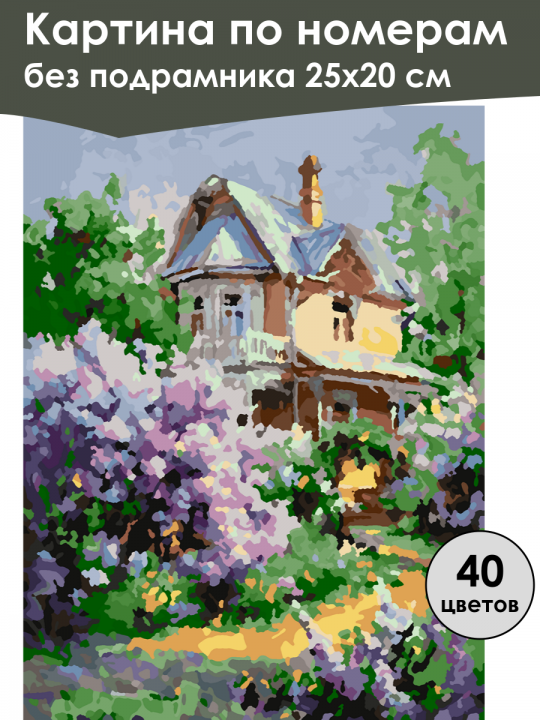 Картина по номерам без подрамника, размер 25х20 см, произведена нами. Она включает 40 оттенков и 1806 контуров, что придаёт ей глубину цвета и плавные переходы. Картина выглядит более ярко и живо. В комплект входит глянцевый лак, которым можно покрыть работу по желанию. Краски качественные, имеют хорошую укрывистость, хватает двух проходов что бы закрасить символы на схеме. Они упакованы герметично, что сохраняет их жидкими. Все необходимые инструменты для начала работы также включены в комплект. Мы не используем экосольвентные чернила, которые содержат свинец и могут быть вредны для здоровья. Наши картины напечатаны безопасными водными пигментными чернилами, обеспечивающими чёткое изображение и легко читаемые обозначения. Холст плотный, имеет мелкую зернистость, легко разглаживается и устойчив к сминанию. Картина поставляется в бурой коробке. Следует отметить, что картина без подрамника её нельзя натянуть на подрамник из-за узких краёв, она предназначена для оформления в рамочку. Живописный пейзаж с домом в стиле старой дачи, окружённой яркими зелёными деревьями и пышным кустарником с цветущей сиренью в ярко-фиолетовых и лиловых тонах, создающей атмосферу спокойствия и уюта на фоне светлого голубого неба.