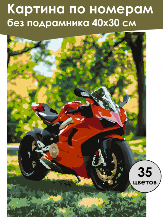 Картина по номерам без подрамника, размер 40х30 см, произведена нами. Она включает 35 оттенков и 2246 контуров, что придаёт ей глубину цвета и плавные переходы. Картина выглядит более ярко и живо. В комплект входит глянцевый лак, которым можно покрыть работу по желанию. Краски имеют хорошую укрывистость, хватает двух проходов что бы закрасить символы на схеме. Так же они сохраняют текстуру мазков, не растекаясь и не разглаживаясь полностью на холсте. При покрытии глянцевым лаком создаётся эффект приближенный к масляной живописи. Краски упакованы герметично, что сохраняет их жидкими. Все необходимые инструменты для начала работы также входят в комплект. Мы не используем экосольвентные чернила, которые содержат свинец и могут быть вредны для здоровья. Наши картины напечатаны безопасными водными пигментными чернилами, обеспечивающими чёткое изображение и легко читаемые обозначения. Холст плотный, имеет мелкую зернистость, легко разглаживается и устойчив к сминанию. Картина поставляется в бурой коробке. Следует отметить, что картина без подрамника её нельзя натянуть на подрамник из-за узких краёв, она предназначена для оформления в рамочку. Мотоцикл ярко-красного цвета, стоящий на траве, окружённой зеленью деревьев; вид сконцентрирован на правой боковой части мотоцикла, демонстрируя его современные линии и блестящие элементы, в то время как на заднем плане размыто видны насыщенные зелёные оттенки листьев, создающие впечатление солнечного дня в парке.