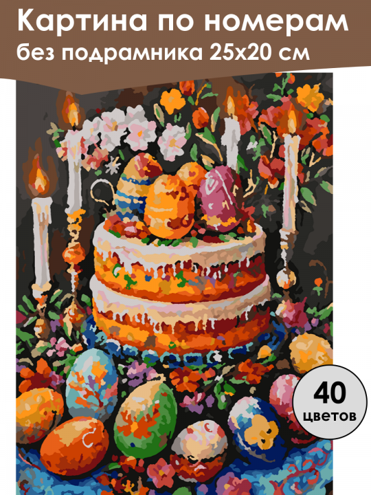 Картина по номерам без подрамника, размер 25х20 см, произведена нами. Она включает 40 оттенков и 1687 контуров, что придаёт ей глубину цвета и плавные переходы. Картина выглядит более ярко и живо. В комплект входит глянцевый лак, которым можно покрыть работу по желанию. Краски качественные, имеют хорошую укрывистость, хватает двух проходов что бы закрасить символы на схеме. Они упакованы герметично, что сохраняет их жидкими. Все необходимые инструменты для начала работы также включены в комплект. Мы не используем экосольвентные чернила, которые содержат свинец и могут быть вредны для здоровья. Наши картины напечатаны безопасными водными пигментными чернилами, обеспечивающими чёткое изображение и легко читаемые обозначения. Холст плотный, имеет мелкую зернистость, легко разглаживается и устойчив к сминанию. Картина поставляется в бурой коробке. Следует отметить, что картина без подрамника её нельзя натянуть на подрамник из-за узких краёв, она предназначена для оформления в рамочку. Яркая праздничная композиция с двухъярусным куличом, украшенным глазурью, на верхнем ярусе которого расположены расписные пасхальные яйца; на переднем плане множество таких же яиц в разнообразном орнаменте, вокруг цветы и зажжённые свечи, создающие атмосферу радости и уюта.