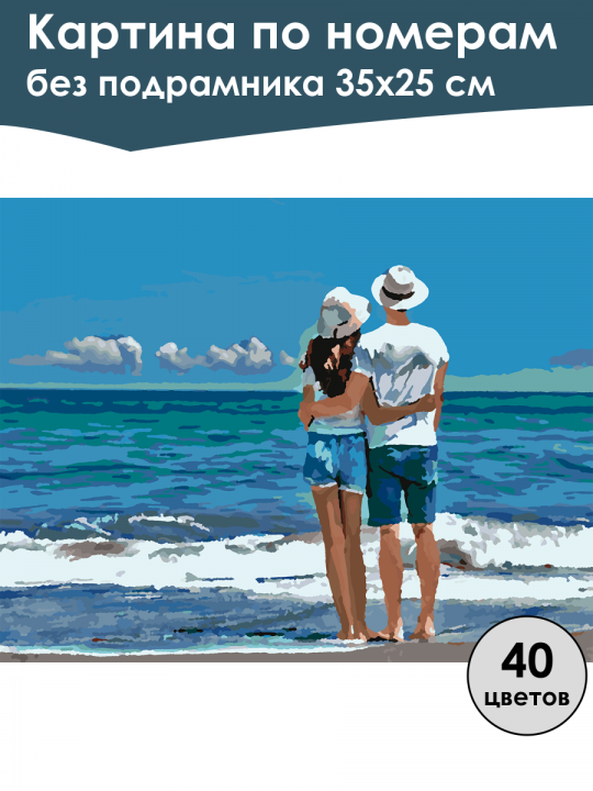Картина по номерам без подрамника, размер 35х25 см, произведена нами. Она включает 40 оттенков и 1241 контуров, что придаёт ей глубину цвета и плавные переходы. Картина выглядит более ярко и живо. В комплект входит глянцевый лак, которым можно покрыть работу по желанию. Краски качественные, имеют хорошую укрывистость, хватает двух проходов что бы закрасить символы на схеме. Они упакованы герметично, что сохраняет их жидкими. Все необходимые инструменты для начала работы также включены в комплект. Мы не используем экосольвентные чернила, которые содержат свинец и могут быть вредны для здоровья. Наши картины напечатаны безопасными водными пигментными чернилами, обеспечивающими чёткое изображение и легко читаемые обозначения. Холст плотный, имеет мелкую зернистость, легко разглаживается и устойчив к сминанию. Картина поставляется в защищённой бурой коробке. Следует отметить, что картина без подрамника её нельзя натянуть на подрамник из-за узких краёв, она предназначена для оформления в рамочку. Пара в белых футболках и шляпах стоит на берегу, обнявшись, и смотрит на волны океана под ясным голубым небом с белыми облаками.