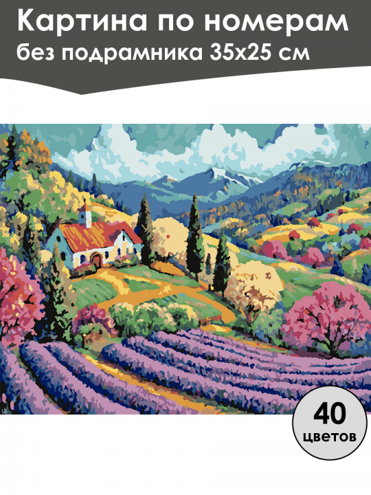Картина по номерам без подрамника, размер 35х25 см, произведена нами. Она включает 40 оттенков и 2702 контуров, что придаёт ей глубину цвета и плавные переходы. Картина выглядит более ярко и живо. В комплект входит глянцевый лак, которым можно покрыть работу по желанию. Краски качественные, имеют хорошую укрывистость, хватает двух проходов что бы закрасить символы на схеме. Они упакованы герметично, что сохраняет их жидкими. Все необходимые инструменты для начала работы также включены в комплект. Мы не используем экосольвентные чернила, которые содержат свинец и могут быть вредны для здоровья. Наши картины напечатаны безопасными водными пигментными чернилами, обеспечивающими чёткое изображение и легко читаемые обозначения. Холст плотный, имеет мелкую зернистость, легко разглаживается и устойчив к сминанию. Картина поставляется в защищённой бурой коробке. Следует отметить, что картина без подрамника её нельзя натянуть на подрамник из-за узких краёв, она предназначена для оформления в рамочку. Пасторальная сцена с цветущими лавандовыми полями на переднем плане, ведущими к небольшому белому дому с красной крышей среди зелёных холмов, окруженных цветущими деревьями и высокими кипарисами, а на заднем плане видны заснеженные горы под голубым небом с облаками.