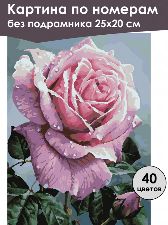 Картина по номерам без подрамника, размер 25х20 см, произведена нами. Она включает 40 оттенков и 1190 контуров, что придаёт ей глубину цвета и плавные переходы. Картина выглядит более ярко и живо. В комплект входит глянцевый лак, которым можно покрыть работу по желанию. Краски качественные, имеют хорошую укрывистость, хватает двух проходов что бы закрасить символы на схеме. Они упакованы герметично, что сохраняет их жидкими. Все необходимые инструменты для начала работы также включены в комплект. Мы не используем экосольвентные чернила, которые содержат свинец и могут быть вредны для здоровья. Наши картины напечатаны безопасными водными пигментными чернилами, обеспечивающими чёткое изображение и легко читаемые обозначения. Холст плотный, имеет мелкую зернистость, легко разглаживается и устойчив к сминанию. Картина поставляется в бурой коробке. Следует отметить, что картина без подрамника её нельзя натянуть на подрамник из-за узких краёв, она предназначена для оформления в рамочку. Розовая роза с бутоном и каплями воды на лепестках, выполняющий декоративно-графический стиль, на фоне видеообоев сине-серого оттенка и зелёных листьев.