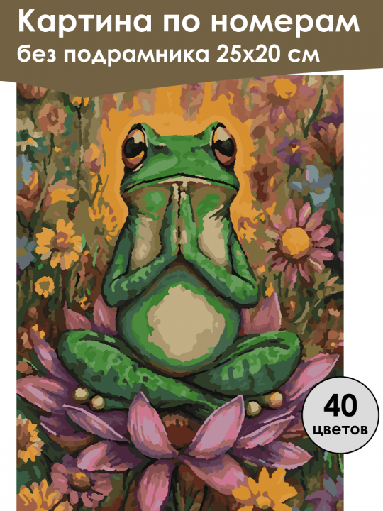 Картина по номерам без подрамника, размер 25х20 см, произведена нами. Она включает 40 оттенков и 1830 контуров, что придаёт ей глубину цвета и плавные переходы. Картина выглядит более ярко и живо. В комплект входит глянцевый лак, которым можно покрыть работу по желанию. Краски качественные, имеют хорошую укрывистость, хватает двух проходов что бы закрасить символы на схеме. Они упакованы герметично, что сохраняет их жидкими. Все необходимые инструменты для начала работы также включены в комплект. Мы не используем экосольвентные чернила, которые содержат свинец и могут быть вредны для здоровья. Наши картины напечатаны безопасными водными пигментными чернилами, обеспечивающими чёткое изображение и легко читаемые обозначения. Холст плотный, имеет мелкую зернистость, легко разглаживается и устойчив к сминанию. Картина поставляется в бурой коробке. Следует отметить, что картина без подрамника её нельзя натянуть на подрамник из-за узких краёв, она предназначена для оформления в рамочку. Яркая и красочная картина, где лягушка в позе лотоса сидит на большом розово-фиолетовом цветке с закрытыми глазами и сложенными в молитве лапами, окружённом множеством разнообразных цветов на фоне из оранжево-коричневых оттенков.