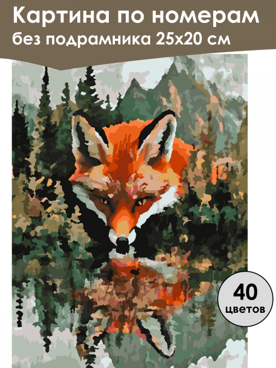 Картина по номерам без подрамника, размер 25х20 см, произведена нами. Она включает 40 оттенков и 1726 контуров, что придаёт ей глубину цвета и плавные переходы. Картина выглядит более ярко и живо. В комплект входит глянцевый лак, которым можно покрыть работу по желанию. Краски качественные, имеют хорошую укрывистость, хватает двух проходов что бы закрасить символы на схеме. Они упакованы герметично, что сохраняет их жидкими. Все необходимые инструменты для начала работы также включены в комплект. Мы не используем экосольвентные чернила, которые содержат свинец и могут быть вредны для здоровья. Наши картины напечатаны безопасными водными пигментными чернилами, обеспечивающими чёткое изображение и легко читаемые обозначения. Холст плотный, имеет мелкую зернистость, легко разглаживается и устойчив к сминанию. Картина поставляется в бурой коробке. Следует отметить, что картина без подрамника её нельзя натянуть на подрамник из-за узких краёв, она предназначена для оформления в рамочку. Фантазийное изображение, на котором крупная рыжая лиса склоняется над зеркальной гладью озера, отражающего её изображение, на фоне видны высокие ели и величественные горы.