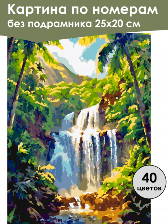 Картина по номерам без подрамника, размер 25х20 см, произведена нами. Она включает 40 оттенков и 1837 контуров, что придаёт ей глубину цвета и плавные переходы. Картина выглядит более ярко и живо. В комплект входит глянцевый лак, которым можно покрыть работу по желанию. Краски качественные, имеют хорошую укрывистость, хватает двух проходов что бы закрасить символы на схеме. Они упакованы герметично, что сохраняет их жидкими. Все необходимые инструменты для начала работы также включены в комплект. Мы не используем экосольвентные чернила, которые содержат свинец и могут быть вредны для здоровья. Наши картины напечатаны безопасными водными пигментными чернилами, обеспечивающими чёткое изображение и легко читаемые обозначения. Холст плотный, имеет мелкую зернистость, легко разглаживается и устойчив к сминанию. Картина поставляется в бурой коробке. Следует отметить, что картина без подрамника её нельзя натянуть на подрамник из-за узких краёв, она предназначена для оформления в рамочку. Тропический пейзаж с водопадом, окружённым пышной зеленью и пальмами, под ярким голубым небом, выполненная в стилизованной манере с яркими цветами и контрастами, создающими атмосферу естественной красоты и спокойствия.