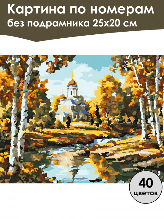 Картина по номерам без подрамника, размер 25х20 см, произведена нами. Она включает 40 оттенков и 2114 контуров, что придаёт ей глубину цвета и плавные переходы. Картина выглядит более ярко и живо. В комплект входит глянцевый лак, которым можно покрыть работу по желанию. Краски качественные, имеют хорошую укрывистость, хватает двух проходов что бы закрасить символы на схеме. Они упакованы герметично, что сохраняет их жидкими. Все необходимые инструменты для начала работы также включены в комплект. Мы не используем экосольвентные чернила, которые содержат свинец и могут быть вредны для здоровья. Наши картины напечатаны безопасными водными пигментными чернилами, обеспечивающими чёткое изображение и легко читаемые обозначения. Холст плотный, имеет мелкую зернистость, легко разглаживается и устойчив к сминанию. Картина поставляется в бурой коробке. Следует отметить, что картина без подрамника её нельзя натянуть на подрамник из-за узких краёв, она предназначена для оформления в рамочку. Осенний пейзаж с церковью на заднем плане и деревьями с желто-оранжевой листвой, отражающимися в спокойной реке; церковь увенчана золотыми куполами, а небо чистое с редкими облаками.