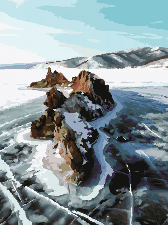Картина по номерам на подрамнике, размер 35х25 см, произведена нами. Она включает 40 оттенков и 1874 контуров, что придаёт ей глубину цвета и плавные переходы. Картина выглядит более ярко и живо. В комплект входит глянцевый лак, которым можно покрыть работу по желанию. Краски имеют хорошую укрывистость, хватает двух проходов что бы закрасить символы на схеме. Так же они сохраняют текстуру мазков, не растекаясь и не разглаживаясь полностью на холсте. При покрытии глянцевым лаком создаётся эффект приближенный к масляной живописи. Краски упакованы герметично, что сохраняет их жидкими. Все необходимые инструменты для начала работы также включены в комплект, в том числе и крепления на стену. В картине используется крепкий подрамник со специальной вставкой, которая предотвращает провисание холста во время рисования. Это обеспечивает комфортный процесс работы и гарантирует, что холст всегда будет оставаться хорошо натянутым. Мы не используем экосольвентные чернила, которые содержат свинец и могут быть вредны для здоровья. Наши картины напечатаны безопасными водными пигментными чернилами, обеспечивающими чёткое изображение и легко читаемые обозначения. Холст плотный, имеет мелкую зернистость, легко разглаживается и устойчив к сминанию. Картина поставляется в защищённой бурой коробке. Заснеженная скалистая местность на фоне покрытой льдом водоёма, где тёмные скалы выделяются на светлом фоне снега и льда, простирающегося вдаль до невысоких гор под голубым небом.