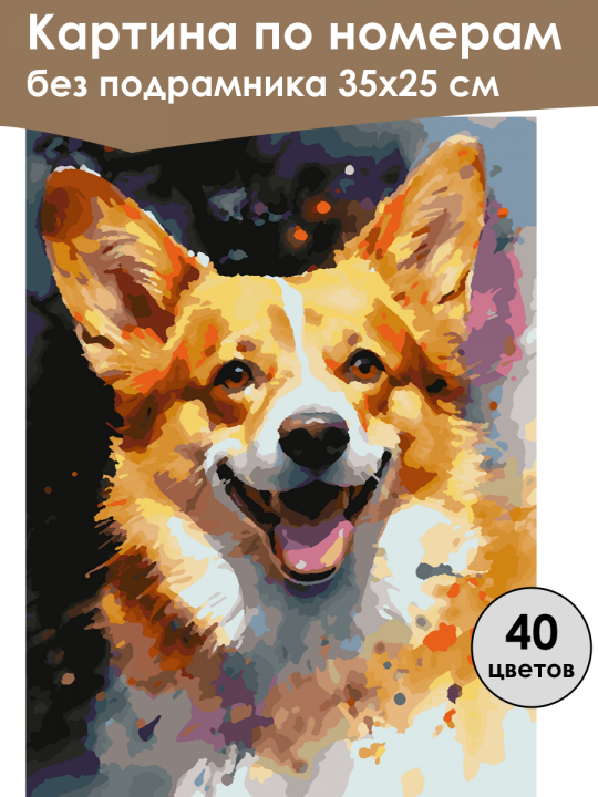 Картина по номерам без подрамника, размер 35х25 см, произведена нами. Она включает 40 оттенков и 1626 контуров, что придаёт ей глубину цвета и плавные переходы. Картина выглядит более ярко и живо. В комплект входит глянцевый лак, которым можно покрыть работу по желанию. Краски качественные, имеют хорошую укрывистость, хватает двух проходов что бы закрасить символы на схеме. Они упакованы герметично, что сохраняет их жидкими. Все необходимые инструменты для начала работы также включены в комплект. Мы не используем экосольвентные чернила, которые содержат свинец и могут быть вредны для здоровья. Наши картины напечатаны безопасными водными пигментными чернилами, обеспечивающими чёткое изображение и легко читаемые обозначения. Холст плотный, имеет мелкую зернистость, легко разглаживается и устойчив к сминанию. Картина поставляется в защищённой бурой коробке. Следует отметить, что картина без подрамника её нельзя натянуть на подрамник из-за узких краёв, она предназначена для оформления в рамочку. Яркая цифровая иллюстрация собаки породы корги с крупными ушами и счастливо открытой пастью, выполненная в стиле, напоминающем масляную живопись, с использованием насыщенных оттенков оранжевого, белого, чёрного и фиолетового цветов.