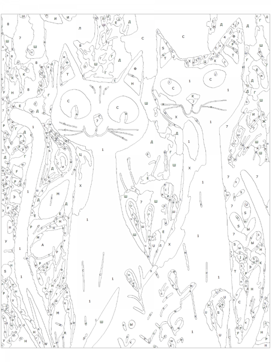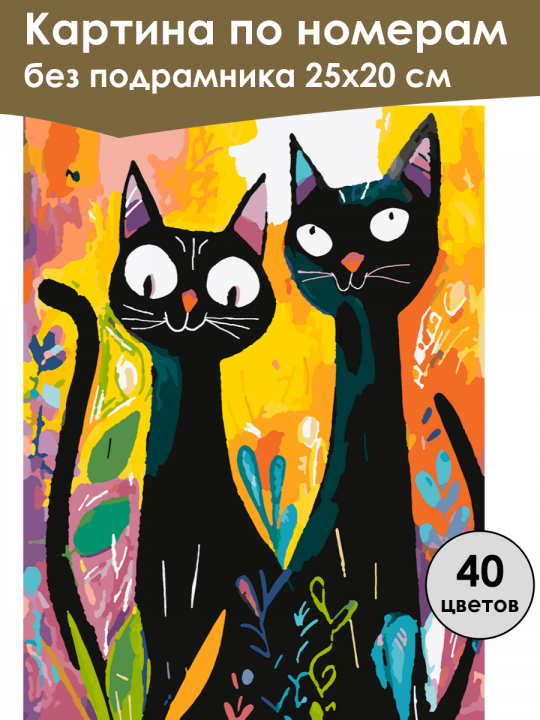 Картина по номерам без подрамника, размер 25х20 см, произведена нами. Она включает 40 оттенков и 556 контуров, что придаёт ей глубину цвета и плавные переходы. Картина выглядит более ярко и живо. В комплект входит глянцевый лак, которым можно покрыть работу по желанию. Краски качественные, имеют хорошую укрывистость, хватает двух проходов что бы закрасить символы на схеме. Они упакованы герметично, что сохраняет их жидкими. Все необходимые инструменты для начала работы также включены в комплект. Мы не используем экосольвентные чернила, которые содержат свинец и могут быть вредны для здоровья. Наши картины напечатаны безопасными водными пигментными чернилами, обеспечивающими чёткое изображение и легко читаемые обозначения. Холст плотный, имеет мелкую зернистость, легко разглаживается и устойчив к сминанию. Картина поставляется в бурой коробке. Следует отметить, что картина без подрамника её нельзя натянуть на подрамник из-за узких краёв, она предназначена для оформления в рамочку. Два черных кота с большими белыми глазами и розовыми ушками, стоящие рядом на фоне ярких, разноцветных пятен, напоминающих абстрактные растения и солнечные лучи, создающие жизнерадостное и игривое настроение.