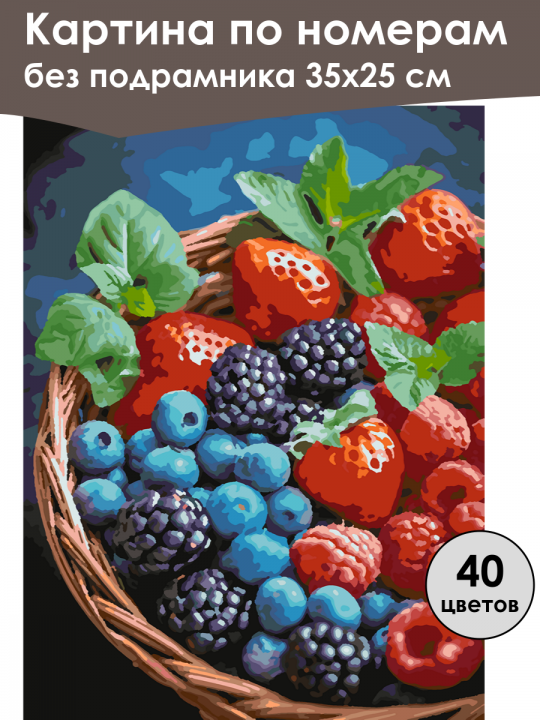 Картина по номерам без подрамника, размер 35х25 см, произведена нами. Она включает 40 оттенков и 1917 контуров, что придаёт ей глубину цвета и плавные переходы. Картина выглядит более ярко и живо. В комплект входит глянцевый лак, которым можно покрыть работу по желанию. Краски качественные, имеют хорошую укрывистость, хватает двух проходов что бы закрасить символы на схеме. Они упакованы герметично, что сохраняет их жидкими. Все необходимые инструменты для начала работы также включены в комплект. Мы не используем экосольвентные чернила, которые содержат свинец и могут быть вредны для здоровья. Наши картины напечатаны безопасными водными пигментными чернилами, обеспечивающими чёткое изображение и легко читаемые обозначения. Холст плотный, имеет мелкую зернистость, легко разглаживается и устойчив к сминанию. Картина поставляется в защищённой бурой коробке. Следует отметить, что картина без подрамника её нельзя натянуть на подрамник из-за узких краёв, она предназначена для оформления в рамочку. Корзина, наполненная разнообразными свежими ягодами, включая клубнику, ежевику, голубику и малину, украшенными зелёными листьями, на тёмном фоне.