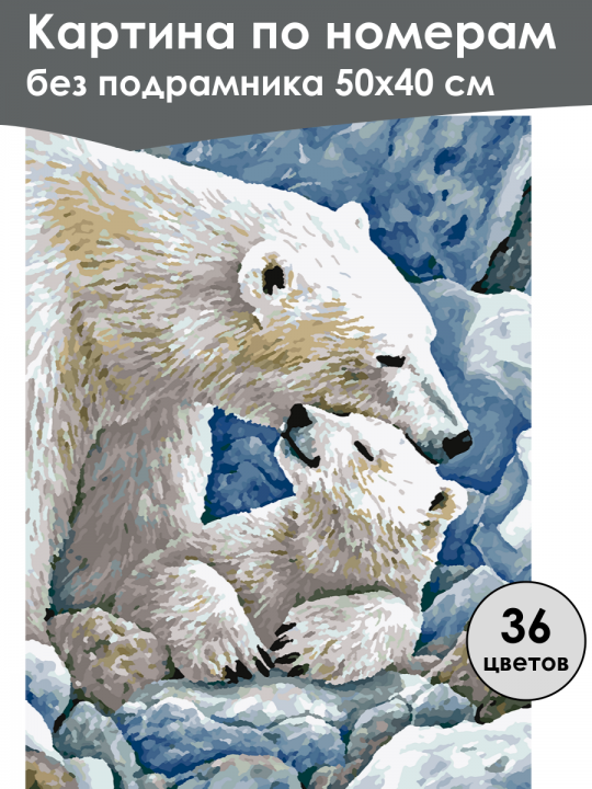 Картина по номерам без подрамника, размер 50х40 см, произведена нами. Она включает 36 оттенков и 3871 контуров, что придаёт ей глубину цвета и плавные переходы. Картина выглядит более ярко и живо. В комплект входит глянцевый лак, которым можно покрыть работу по желанию. Краски имеют хорошую укрывистость, хватает двух проходов что бы закрасить символы на схеме. Так же они сохраняют текстуру мазков, не растекаясь и не разглаживаясь полностью на холсте. При покрытии глянцевым лаком создаётся эффект приближенный к масляной живописи. Краски упакованы герметично, что сохраняет их жидкими. Все необходимые инструменты для начала работы также входят в комплект. Мы не используем экосольвентные чернила, которые содержат свинец и могут быть вредны для здоровья. Наши картины напечатаны безопасными водными пигментными чернилами, обеспечивающими чёткое изображение и легко читаемые обозначения. Холст плотный, имеет мелкую зернистость, легко разглаживается и устойчив к сминанию. Картина поставляется в бурой коробке. Следует отметить, что картина без подрамника её нельзя натянуть на подрамник из-за узких краёв, она предназначена для оформления в рамочку. Два белых медведя, взрослый и детёныш, находятся в нежной позе на фоне снежных и ледяных глыб, взрослый медведь склонился к детёнышу, создавая атмосферу заботы и тепла.