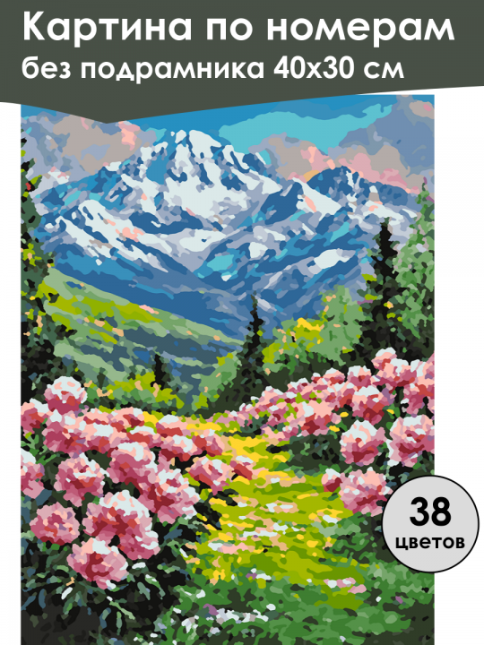 Картина по номерам без подрамника, размер 40х30 см, произведена нами. Она включает 38 оттенков и 3189 контуров, что придаёт ей глубину цвета и плавные переходы. Картина выглядит более ярко и живо. В комплект входит глянцевый лак, которым можно покрыть работу по желанию. Краски имеют хорошую укрывистость, хватает двух проходов что бы закрасить символы на схеме. Так же они сохраняют текстуру мазков, не растекаясь и не разглаживаясь полностью на холсте. При покрытии глянцевым лаком создаётся эффект приближенный к масляной живописи. Краски упакованы герметично, что сохраняет их жидкими. Все необходимые инструменты для начала работы также входят в комплект. Мы не используем экосольвентные чернила, которые содержат свинец и могут быть вредны для здоровья. Наши картины напечатаны безопасными водными пигментными чернилами, обеспечивающими чёткое изображение и легко читаемые обозначения. Холст плотный, имеет мелкую зернистость, легко разглаживается и устойчив к сминанию. Картина поставляется в бурой коробке. Следует отметить, что картина без подрамника её нельзя натянуть на подрамник из-за узких краёв, она предназначена для оформления в рамочку. Красочный пейзаж с живописными горами на заднем плане, покрытыми снегом, под ними расположены зелёные холмы, усаженные цветущими кустами розовых цветов пионов, создающими яркий контраст с синевой неба и белизной вершин; среди зелени выделяются высокие тёмные деревья, а тропинка жёлтого оттенка ведёт взгляд вглубь кадра, усиливая эффект перспективы и вызывая чувство спокойствия и гармонии природы.