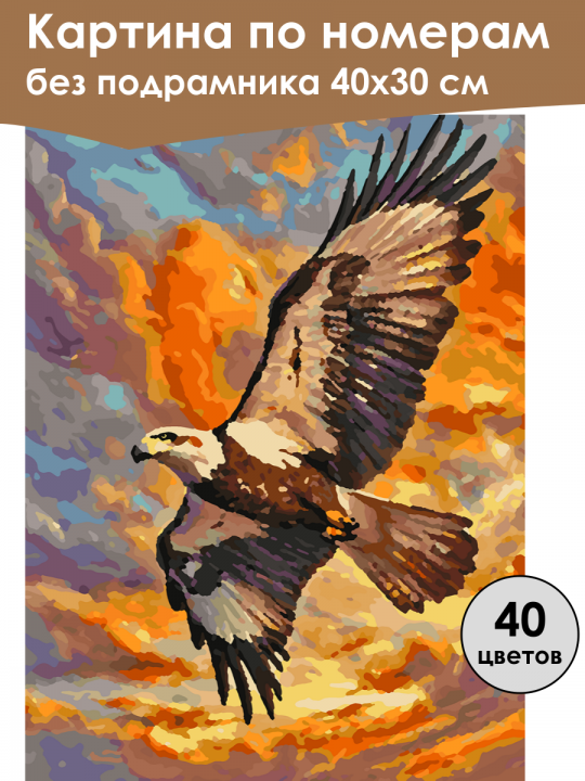 Картина по номерам без подрамника, размер 40х30 см, произведена нами. Она включает 40 оттенков и 2290 контуров, что придаёт ей глубину цвета и плавные переходы. Картина выглядит более ярко и живо. В комплект входит глянцевый лак, которым можно покрыть работу по желанию. Краски имеют хорошую укрывистость, хватает двух проходов что бы закрасить символы на схеме. Так же они сохраняют текстуру мазков, не растекаясь и не разглаживаясь полностью на холсте. При покрытии глянцевым лаком создаётся эффект приближенный к масляной живописи. Краски упакованы герметично, что сохраняет их жидкими. Все необходимые инструменты для начала работы также входят в комплект. Мы не используем экосольвентные чернила, которые содержат свинец и могут быть вредны для здоровья. Наши картины напечатаны безопасными водными пигментными чернилами, обеспечивающими чёткое изображение и легко читаемые обозначения. Холст плотный, имеет мелкую зернистость, легко разглаживается и устойчив к сминанию. Картина поставляется в бурой коробке. Следует отметить, что картина без подрамника её нельзя натянуть на подрамник из-за узких краёв, она предназначена для оформления в рамочку. Крупная хищная птица парит в небе с яркими красками заката; её мощные крылья расправлены, создавая впечатляющий силуэт на фоне живописного неба с оттенками оранжевого, жёлтого и синего, похожее на художественную иллюстрацию.