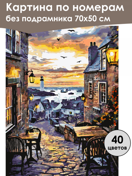 Картина по номерам без подрамника, размер 70х50 см, произведена нами. Она включает 40 оттенков и 3509 контуров, что придаёт ей глубину цвета и плавные переходы. Картина выглядит более ярко и живо. В комплект входит глянцевый лак, которым можно покрыть работу по желанию. Краски имеют хорошую укрывистость, хватает двух проходов что бы закрасить символы на схеме. Так же они сохраняют текстуру мазков, не растекаясь и не разглаживаясь полностью на холсте. При покрытии глянцевым лаком создаётся эффект приближенный к масляной живописи. Краски упакованы герметично, что сохраняет их жидкими. Все необходимые инструменты для начала работы также входят в комплект. Мы не используем экосольвентные чернила, которые содержат свинец и могут быть вредны для здоровья. Наши картины напечатаны безопасными водными пигментными чернилами, обеспечивающими чёткое изображение и легко читаемые обозначения. Холст плотный, имеет мелкую зернистость, легко разглаживается и устойчив к сминанию. Картина поставляется в бурой коробке. Следует отметить, что картина без подрамника её нельзя натянуть на подрамник из-за узких краёв, она предназначена для оформления в рамочку. Узкая каменная улочка, обрамленная уютными домами с окнами и фонарями, ведет к живописному побережью с маяком на фоне яркого заката, где в небе парят птицы, а уличные столики и стулья создают атмосферу уюта и спокойствия.