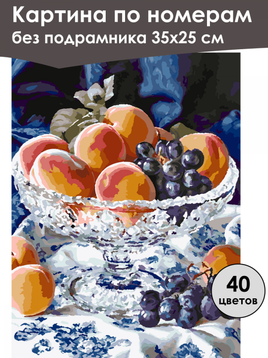 Картина по номерам без подрамника, размер 35х25 см, произведена нами. Она включает 40 оттенков и 2297 контуров, что придаёт ей глубину цвета и плавные переходы. Картина выглядит более ярко и живо. В комплект входит глянцевый лак, которым можно покрыть работу по желанию. Краски качественные, имеют хорошую укрывистость, хватает двух проходов что бы закрасить символы на схеме. Они упакованы герметично, что сохраняет их жидкими. Все необходимые инструменты для начала работы также включены в комплект. Мы не используем экосольвентные чернила, которые содержат свинец и могут быть вредны для здоровья. Наши картины напечатаны безопасными водными пигментными чернилами, обеспечивающими чёткое изображение и легко читаемые обозначения. Холст плотный, имеет мелкую зернистость, легко разглаживается и устойчив к сминанию. Картина поставляется в защищённой бурой коробке. Следует отметить, что картина без подрамника её нельзя натянуть на подрамник из-за узких краёв, она предназначена для оформления в рамочку. Хрустальная ваза, наполненная спелыми персиками и гроздьями тёмного винограда, на фоне темно-синей драпировки.
