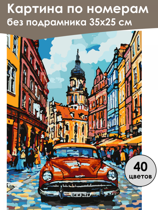 Картина по номерам без подрамника, размер 35х25 см, произведена нами. Она включает 40 оттенков и 2101 контуров, что придаёт ей глубину цвета и плавные переходы. Картина выглядит более ярко и живо. В комплект входит глянцевый лак, которым можно покрыть работу по желанию. Краски качественные, имеют хорошую укрывистость, хватает двух проходов что бы закрасить символы на схеме. Они упакованы герметично, что сохраняет их жидкими. Все необходимые инструменты для начала работы также включены в комплект. Мы не используем экосольвентные чернила, которые содержат свинец и могут быть вредны для здоровья. Наши картины напечатаны безопасными водными пигментными чернилами, обеспечивающими чёткое изображение и легко читаемые обозначения. Холст плотный, имеет мелкую зернистость, легко разглаживается и устойчив к сминанию. Картина поставляется в защищённой бурой коробке. Следует отметить, что картина без подрамника её нельзя натянуть на подрамник из-за узких краёв, она предназначена для оформления в рамочку. Стильный рисунок городского пейзажа с красочным видом старинной улицы, фокусирующейся на ярко-красном ретро-автомобиле на переднем плане; окружающие здания выполнены в теплых оттенках, создавая атмосферу прошлого века, при этом вдалеке виднеются архитектурные элементы с башнями на фоне голубого неба с облаками, улица наполнена силуэтами прохожих, добавляя живости и динамики сцене.