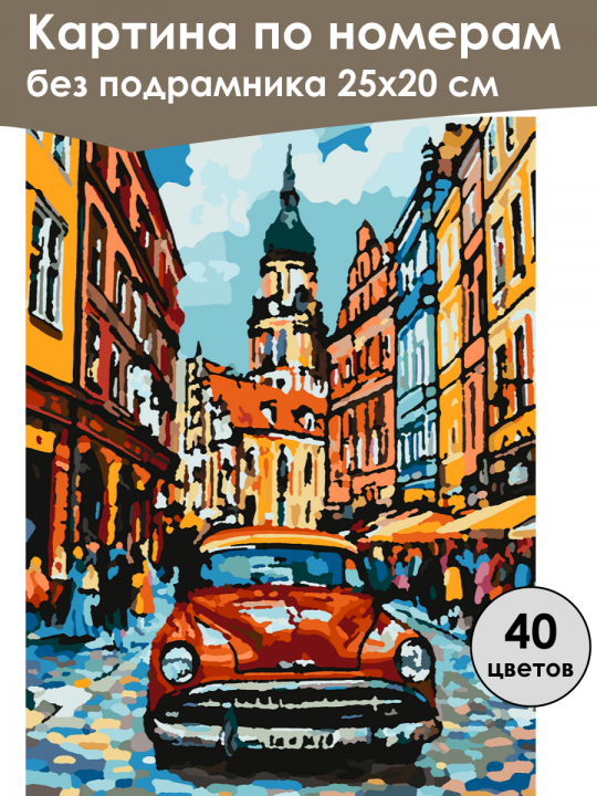 Картина по номерам без подрамника, размер 25х20 см, произведена нами. Она включает 40 оттенков и 1406 контуров, что придаёт ей глубину цвета и плавные переходы. Картина выглядит более ярко и живо. В комплект входит глянцевый лак, которым можно покрыть работу по желанию. Краски качественные, имеют хорошую укрывистость, хватает двух проходов что бы закрасить символы на схеме. Они упакованы герметично, что сохраняет их жидкими. Все необходимые инструменты для начала работы также включены в комплект. Мы не используем экосольвентные чернила, которые содержат свинец и могут быть вредны для здоровья. Наши картины напечатаны безопасными водными пигментными чернилами, обеспечивающими чёткое изображение и легко читаемые обозначения. Холст плотный, имеет мелкую зернистость, легко разглаживается и устойчив к сминанию. Картина поставляется в бурой коробке. Следует отметить, что картина без подрамника её нельзя натянуть на подрамник из-за узких краёв, она предназначена для оформления в рамочку. Стильный рисунок городского пейзажа с красочным видом старинной улицы, фокусирующейся на ярко-красном ретро-автомобиле на переднем плане; окружающие здания выполнены в теплых оттенках, создавая атмосферу прошлого века, при этом вдалеке виднеются архитектурные элементы с башнями на фоне голубого неба с облаками, улица наполнена силуэтами прохожих, добавляя живости и динамики сцене.