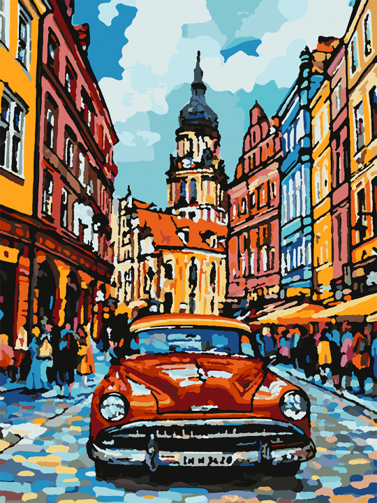 Картина по номерам на подрамнике, размер 25х20 см, произведена нами. Она включает 40 оттенков и 1406 контуров, что придаёт ей глубину цвета и плавные переходы. Картина выглядит более ярко и живо. В комплект входит глянцевый лак, которым можно покрыть работу по желанию. Краски имеют хорошую укрывистость, хватает двух проходов что бы закрасить символы на схеме. Так же они сохраняют текстуру мазков, не растекаясь и не разглаживаясь полностью на холсте. При покрытии глянцевым лаком создаётся эффект приближенный к масляной живописи. Краски упакованы герметично, что сохраняет их жидкими. Все необходимые инструменты для начала работы также включены в комплект, в том числе и крепления на стену. В картине используется крепкий подрамник со специальной вставкой, которая предотвращает провисание холста во время рисования. Это обеспечивает комфортный процесс работы и гарантирует, что холст всегда будет оставаться хорошо натянутым. Мы не используем экосольвентные чернила, которые содержат свинец и могут быть вредны для здоровья. Наши картины напечатаны безопасными водными пигментными чернилами, обеспечивающими чёткое изображение и легко читаемые обозначения. Холст плотный, имеет мелкую зернистость, легко разглаживается и устойчив к сминанию. Картина поставляется в защищённой бурой коробке. Стильный рисунок городского пейзажа с красочным видом старинной улицы, фокусирующейся на ярко-красном ретро-автомобиле на переднем плане; окружающие здания выполнены в теплых оттенках, создавая атмосферу прошлого века, при этом вдалеке виднеются архитектурные элементы с башнями на фоне голубого неба с облаками, улица наполнена силуэтами прохожих, добавляя живости и динамики сцене.