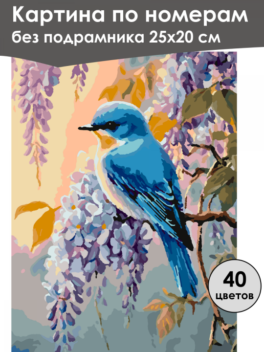 Картина по номерам без подрамника, размер 25х20 см, произведена нами. Она включает 40 оттенков и 1255 контуров, что придаёт ей глубину цвета и плавные переходы. Картина выглядит более ярко и живо. В комплект входит глянцевый лак, которым можно покрыть работу по желанию. Краски качественные, имеют хорошую укрывистость, хватает двух проходов что бы закрасить символы на схеме. Они упакованы герметично, что сохраняет их жидкими. Все необходимые инструменты для начала работы также включены в комплект. Мы не используем экосольвентные чернила, которые содержат свинец и могут быть вредны для здоровья. Наши картины напечатаны безопасными водными пигментными чернилами, обеспечивающими чёткое изображение и легко читаемые обозначения. Холст плотный, имеет мелкую зернистость, легко разглаживается и устойчив к сминанию. Картина поставляется в бурой коробке. Следует отметить, что картина без подрамника её нельзя натянуть на подрамник из-за узких краёв, она предназначена для оформления в рамочку. Птица с ярко-синим оперением и белой грудью, сидящая на ветке среди соцветий глицинии с фиолетовыми цветками и зелёными и оранжевыми листьями, созданная в стиле живописи с насыщенными, контрастными акварельными оттенками на фоне мягких пастельных тонов неба.