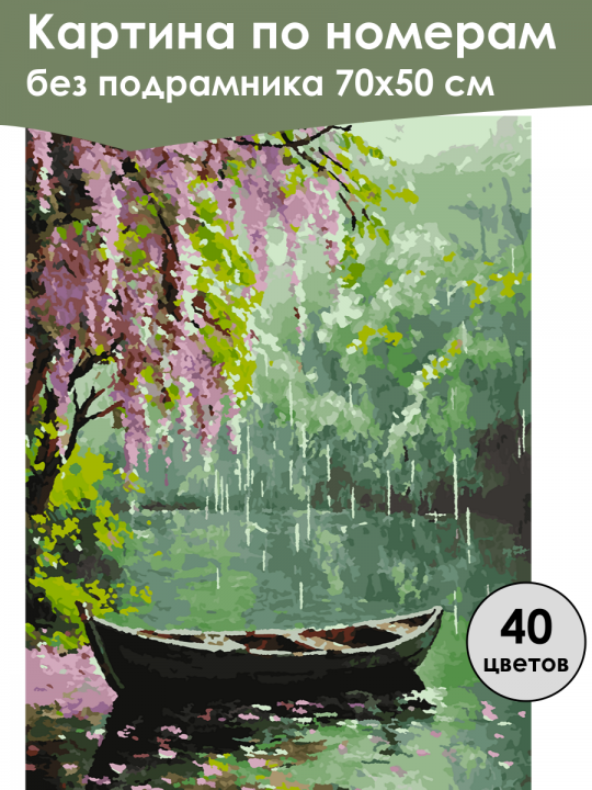 Картина по номерам без подрамника, размер 70х50 см, произведена нами. Она включает 40 оттенков и 3317 контуров, что придаёт ей глубину цвета и плавные переходы. Картина выглядит более ярко и живо. В комплект входит глянцевый лак, которым можно покрыть работу по желанию. Краски имеют хорошую укрывистость, хватает двух проходов что бы закрасить символы на схеме. Так же они сохраняют текстуру мазков, не растекаясь и не разглаживаясь полностью на холсте. При покрытии глянцевым лаком создаётся эффект приближенный к масляной живописи. Краски упакованы герметично, что сохраняет их жидкими. Все необходимые инструменты для начала работы также входят в комплект. Мы не используем экосольвентные чернила, которые содержат свинец и могут быть вредны для здоровья. Наши картины напечатаны безопасными водными пигментными чернилами, обеспечивающими чёткое изображение и легко читаемые обозначения. Холст плотный, имеет мелкую зернистость, легко разглаживается и устойчив к сминанию. Картина поставляется в бурой коробке. Следует отметить, что картина без подрамника её нельзя натянуть на подрамник из-за узких краёв, она предназначена для оформления в рамочку. Лодка покоится на зеркальной поверхности воды, окружённой густой растительностью, с ветвями деревьев, украшенными свисающими розовыми цветами, создавая атмосферу спокойствия и природной гармонии.