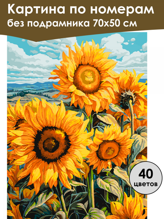 Картина по номерам без подрамника, размер 70х50 см, произведена нами. Она включает 40 оттенков и 3497 контуров, что придаёт ей глубину цвета и плавные переходы. Картина выглядит более ярко и живо. В комплект входит глянцевый лак, которым можно покрыть работу по желанию. Краски имеют хорошую укрывистость, хватает двух проходов что бы закрасить символы на схеме. Так же они сохраняют текстуру мазков, не растекаясь и не разглаживаясь полностью на холсте. При покрытии глянцевым лаком создаётся эффект приближенный к масляной живописи. Краски упакованы герметично, что сохраняет их жидкими. Все необходимые инструменты для начала работы также входят в комплект. Мы не используем экосольвентные чернила, которые содержат свинец и могут быть вредны для здоровья. Наши картины напечатаны безопасными водными пигментными чернилами, обеспечивающими чёткое изображение и легко читаемые обозначения. Холст плотный, имеет мелкую зернистость, легко разглаживается и устойчив к сминанию. Картина поставляется в бурой коробке. Следует отметить, что картина без подрамника её нельзя натянуть на подрамник из-за узких краёв, она предназначена для оформления в рамочку. Яркие подсолнухи возвышаются на фоне живописного пейзажа с голубым небом и легкими облаками, простирающимися над холмами, создавая атмосферу тепла и красоты.