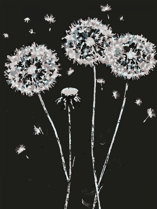 Картина по номерам на подрамнике, размер 70х50 см, произведена нами. Она включает 13 оттенков и 1154 контуров, что придаёт ей глубину цвета и плавные переходы. Картина выглядит более ярко и живо. В комплект входит глянцевый лак, которым можно покрыть работу по желанию. Краски имеют хорошую укрывистость, хватает двух проходов что бы закрасить символы на схеме. Так же они сохраняют текстуру мазков, не растекаясь и не разглаживаясь полностью на холсте. При покрытии глянцевым лаком создаётся эффект приближенный к масляной живописи. Краски упакованы герметично, что сохраняет их жидкими. Все необходимые инструменты для начала работы также включены в комплект, в том числе и крепления на стену. В картине используется крепкий подрамник со специальной вставкой, которая предотвращает провисание холста во время рисования. Это обеспечивает комфортный процесс работы и гарантирует, что холст всегда будет оставаться хорошо натянутым. Мы не используем экосольвентные чернила, которые содержат свинец и могут быть вредны для здоровья. Наши картины напечатаны безопасными водными пигментными чернилами, обеспечивающими чёткое изображение и легко читаемые обозначения. Холст плотный, имеет мелкую зернистость, легко разглаживается и устойчив к сминанию. Картина поставляется в защищённой бурой коробке. Три одуванчика с белыми пушистыми сферическими головками и тонкими стеблями, на тёмном фоне. Вокруг них парят отдельные летающие семена, создавая динамический эффект разлетания. Линии стеблей и очертания листьев нарисованы светлыми штрихами, добавляя изображению художественный шарм и воздушность.
