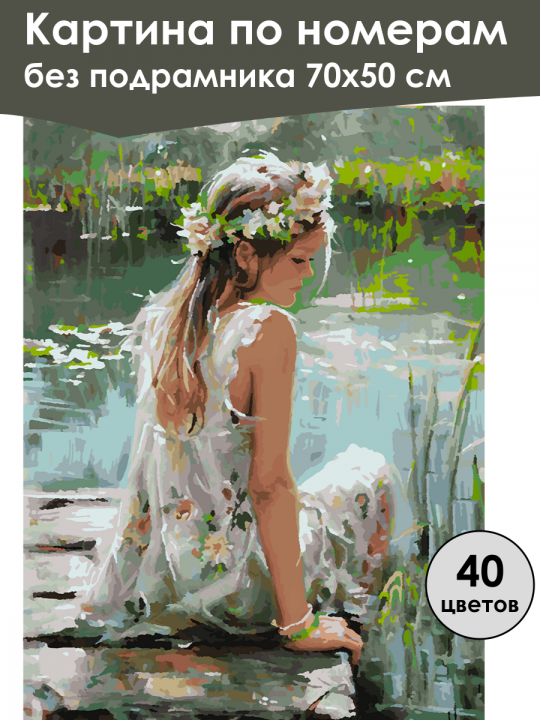 Картина по номерам без подрамника, размер 70х50 см, произведена нами. Она включает 40 оттенков и 3491 контуров, что придаёт ей глубину цвета и плавные переходы. Картина выглядит более ярко и живо. В комплект входит глянцевый лак, которым можно покрыть работу по желанию. Краски имеют хорошую укрывистость, хватает двух проходов что бы закрасить символы на схеме. Так же они сохраняют текстуру мазков, не растекаясь и не разглаживаясь полностью на холсте. При покрытии глянцевым лаком создаётся эффект приближенный к масляной живописи. Краски упакованы герметично, что сохраняет их жидкими. Все необходимые инструменты для начала работы также входят в комплект. Мы не используем экосольвентные чернила, которые содержат свинец и могут быть вредны для здоровья. Наши картины напечатаны безопасными водными пигментными чернилами, обеспечивающими чёткое изображение и легко читаемые обозначения. Холст плотный, имеет мелкую зернистость, легко разглаживается и устойчив к сминанию. Картина поставляется в бурой коробке. Следует отметить, что картина без подрамника её нельзя натянуть на подрамник из-за узких краёв, она предназначена для оформления в рамочку. Девочка, сидящая у воды на деревянном мостике; её светлые волосы украшены венком из цветов, а платье с яркими цветочными узорами гармонично сочетается с зелёно-голубыми оттенками природы вокруг.