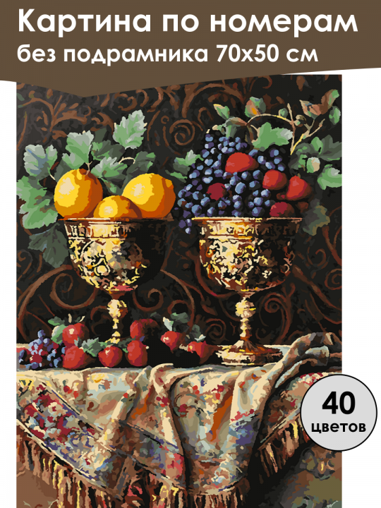 Картина по номерам без подрамника, размер 70х50 см, произведена нами. Она включает 40 оттенков и 3754 контуров, что придаёт ей глубину цвета и плавные переходы. Картина выглядит более ярко и живо. В комплект входит глянцевый лак, которым можно покрыть работу по желанию. Краски имеют хорошую укрывистость, хватает двух проходов что бы закрасить символы на схеме. Так же они сохраняют текстуру мазков, не растекаясь и не разглаживаясь полностью на холсте. При покрытии глянцевым лаком создаётся эффект приближенный к масляной живописи. Краски упакованы герметично, что сохраняет их жидкими. Все необходимые инструменты для начала работы также входят в комплект. Мы не используем экосольвентные чернила, которые содержат свинец и могут быть вредны для здоровья. Наши картины напечатаны безопасными водными пигментными чернилами, обеспечивающими чёткое изображение и легко читаемые обозначения. Холст плотный, имеет мелкую зернистость, легко разглаживается и устойчив к сминанию. Картина поставляется в бурой коробке. Следует отметить, что картина без подрамника её нельзя натянуть на подрамник из-за узких краёв, она предназначена для оформления в рамочку. Два золотых кубка, наполненных фруктами: один с ярко-жёлтыми плодами, другой с виноградинкам и клубникой, на фоне тёмных завитков и зелёной листвы; перед кубками лежат фрукты на богато украшенной скатерти.
